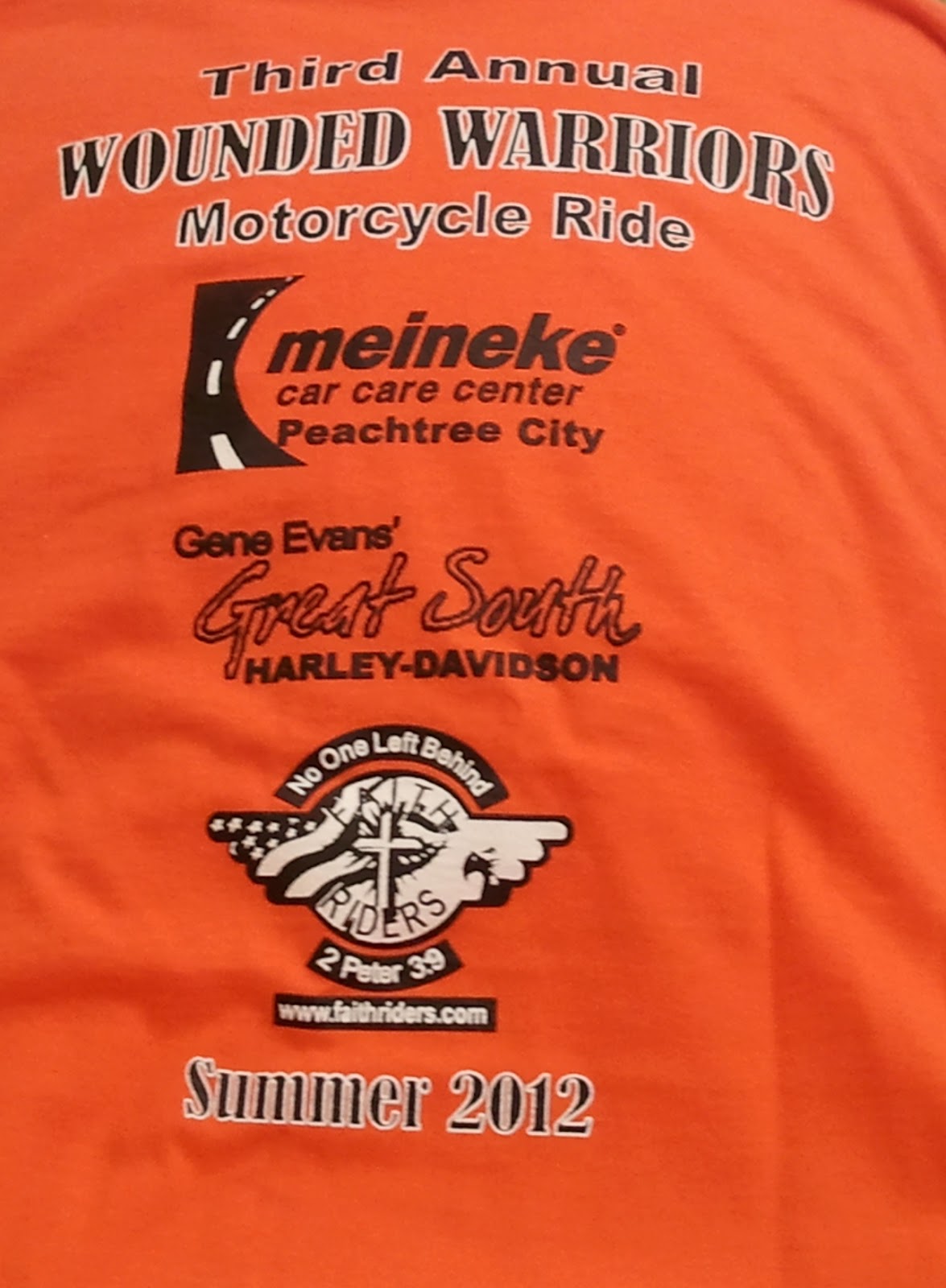 If you’re a rider, I hope you’ll consider joining us tomorrow (Saturday 6/30/12) for the Wounded Warriors Ride. Registration begins at 8:00 AM with KSU (that would be “kick stands up” not Kennesaw State University) at 9:30 AM. We probably won’t beat the heat, but we’ll get a head start on it. And the first 50 people to say “I’m a Joy Rider” at registration will get one of the nifty commemorative T-Shirts pictured below. Hope to see you.